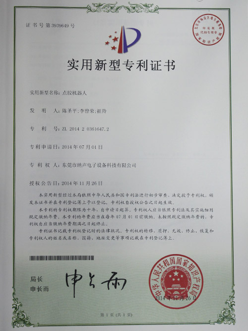Dispensing robot patent certificate