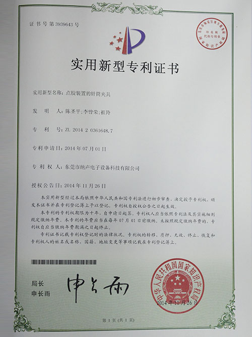 New dispensing equipment patent certificate