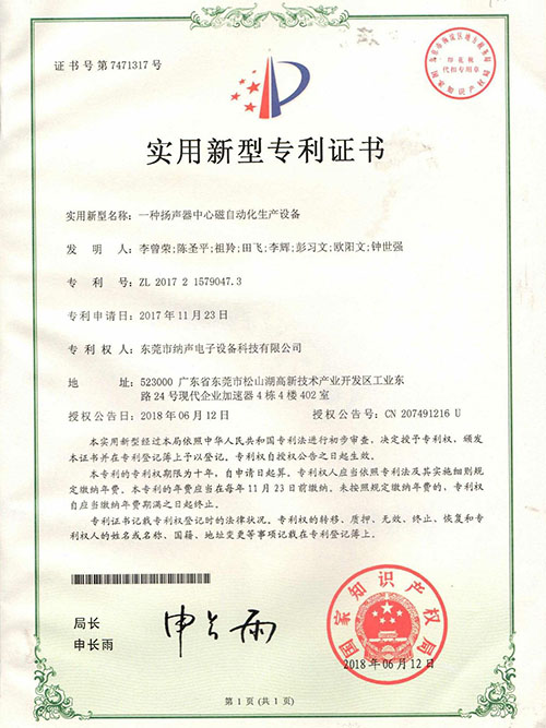 Speaker Center Magnetization Patent Certificate